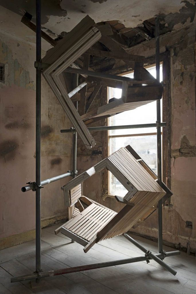 Henry Burns’ piece ’82 screws’, consisting of two forms stacked on top of each other and built of salvaged door frames, wall laths and wooden beams was the clear apotheosis of this effect. It isn’t clear whether these forms are assembling or disassembling, whether they signal the destruction of familiar, comforting ideas of the home, its basic material elements collapsing into an unseen point below the ground, or whether conversely they are exploding outwards from this same point, which functions as both origin and end.