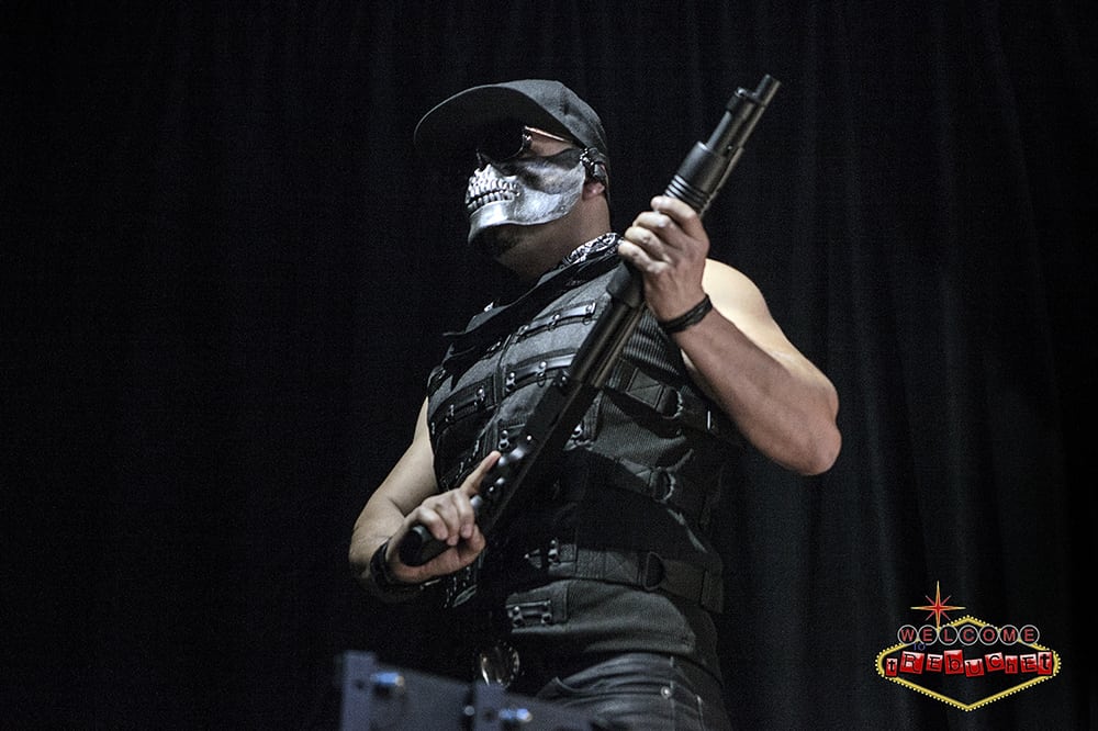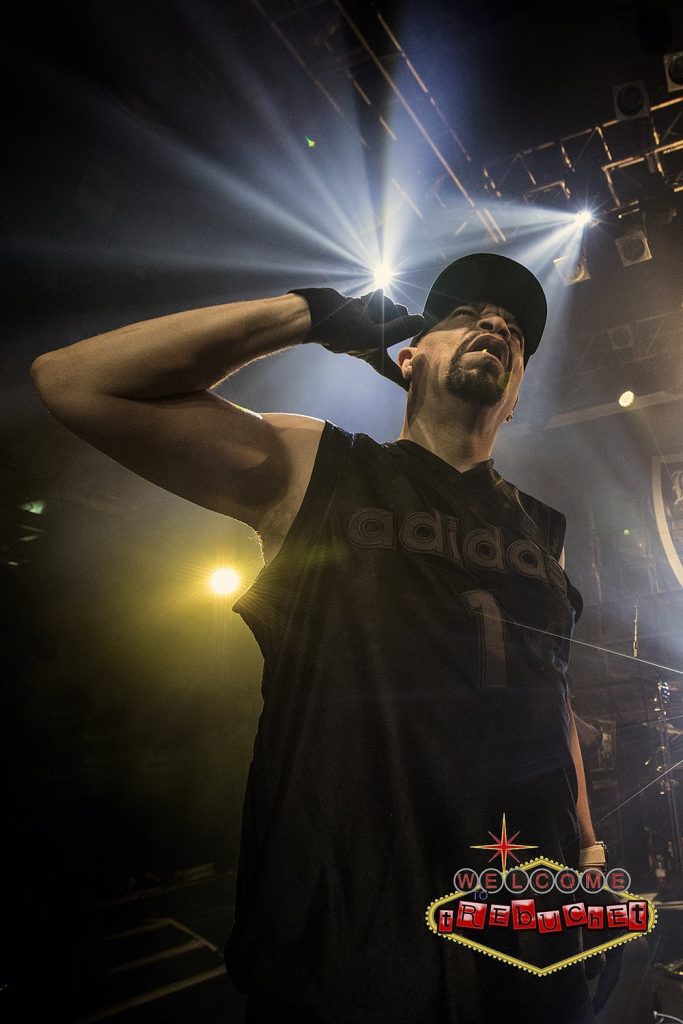 Flanked by a masked faux guard (with flagging deltoids) holding a faux pump action 12 gauge, a sprinkling of theatrical fear enhanced the very commanding presence of Ice-T. Like a black Billy Fucking Idol, he continually squinted out at the crowd with clenched fists and trademark sneers, and proceeded to pour water all over the shoulder-to-shoulder photographers in the press pit, to which we say, Sir, we enjoyed your show but you are a complete MUTHAFU@KER.
