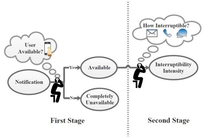 For their study, the researchers developed and evaluated a two-stage model to predict the degree to which people are interruptible by smartphones. The first stage is aimed at predicting whether a user is available at all or unavailable. The second stage gauges whether people are not interruptible, highly not interruptible, highly interruptible, interruptible or neutral toward interruptions, according to Lindqvist.