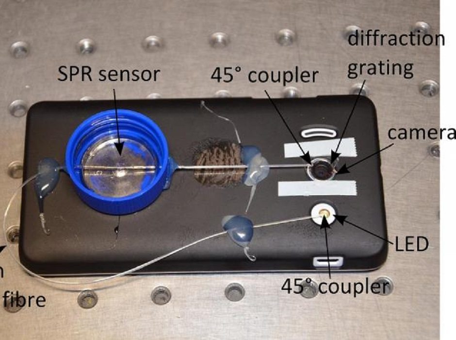 A fiber optic surface plasmon resonance (SPR)-sensor developed for smartphones is pictured