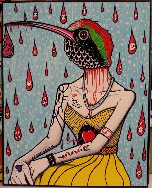 Dubbed by the Boshin Gallery as “one of the most promising artists in Los Angeles today,” Darby Krow is one of the many talented artists included in the gallery’s fourth showcase. His in-your-face iconic imagery which he creates by mixing ink, acrylic and oil together on canvas is anything but forgettable.
