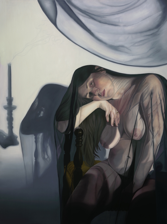 Though depictions of grief and anguish abound in art history, visions of women’s suffering have, on the whole, been rendered through careful theatrics, restraint and control – to express emotion can be an act of piety or romance, of sanitised and therefore palatable maternal love, it can be romantic, even desirable but there are rules that have to be obeyed. The emotion must be contained: it must not threaten to seep out into the surrounding world, to shake our unflinching belief in and need for resolution, it must present some kind of finality, a promise of an end. Luoto’s work as a whole pushes back against that narrative, but especially the paintings in this exhibition. These works were born out of what the artist describes as an intense moment of anguish and rupture, and though they were painted after the fact, they are marked by its residues, in some cases quite literally, with surfaces that appear to drip, leak and ooze. In these works, we are not reliving the experience with her, nor invited to try and make sense of it, but rather to just sit in the shadow world that trauma has opened up.