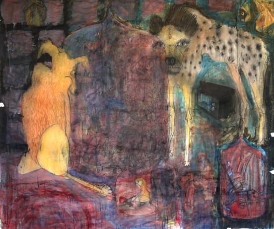 What at first appears a nonsensical mixture of animals and objects soon unfolds as a menacing tea party for the damned. One begins to fear for the fox masked lady; seeing the hunger in the black wolf’s grin, the sadness in the face of the rabbit and the encroaching darkness as more animals join the soiree. The more I peered into the drawing, the more I become another guest, with displaced limbs and plush Conte fur.