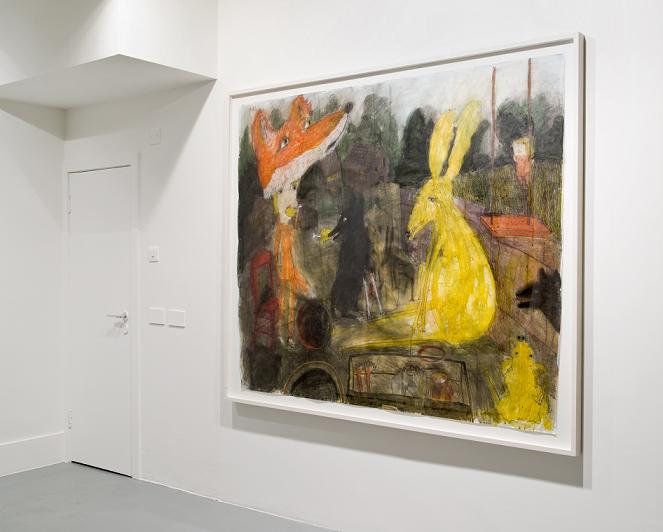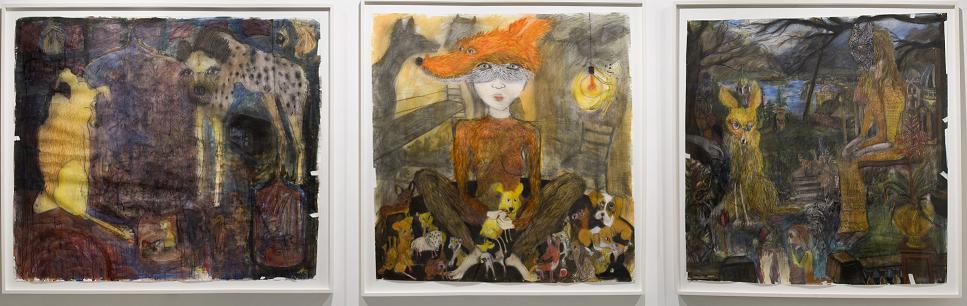 Take the first image that I saw during my visit, ‘An Average Sized Rabbit And Some Exceptionally Small Animals’. At first the bright and sombre faced rabbit takes up most of the view, recovering enough to examine a fox masked woman dining with either a wolf or a big black dog. Their cheeks stuffed with chicken, they sit within a playground. At the forefront are limbs in a box and in the background is a child on a swing.