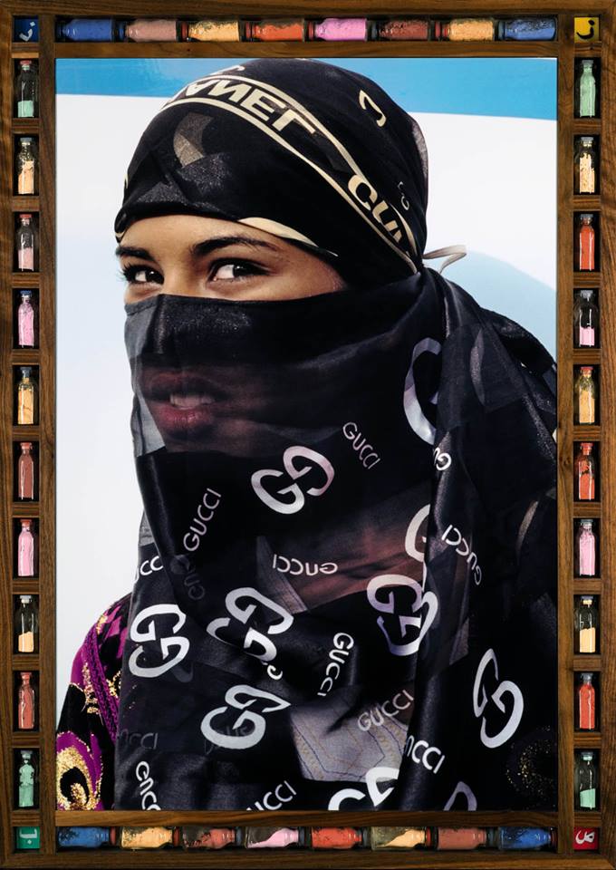 Unlike Keita and Sidibe, however, he goes a step further by including ready-made frames for his photographs. Each contains “a series of recessed spaces in which he places food and other products from Moroccan markets,” as described in the Huffington Press. These, Hajjaj claims, are important. Not only are they intended draw his viewers in to inspect the details of his photographs, but the globally recognized items such as 7-Up and Coca Cola cans that he uses to fill the recessed spaces are symbolic of the burgeoning import market and how such has had an impact on the ever-changing narrative of African tradition.