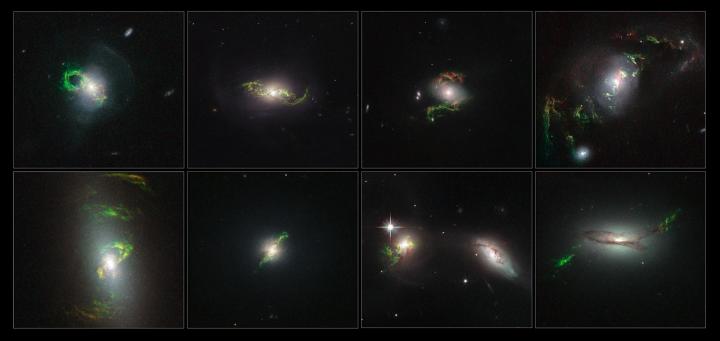Not only are the green filaments far from the centres of their host galaxies, they are also immense in size, spanning tens of thousands of light-years. They are thought to be long tails of gas formed during a violent past merger (between galaxies) — this event would have caused strong gravitational forces that would rip apart the galactic participants.