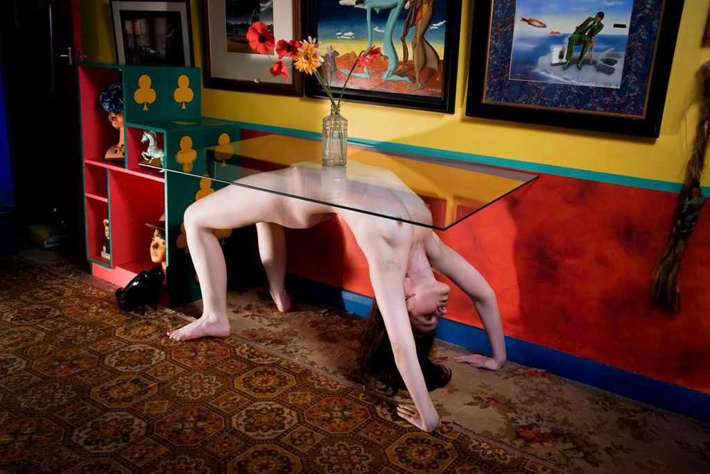 Currently exploring the visual opportunities presented by forniphilia (a form of BDSM where a person is used as household furniture. The best example being Allen Jones’s 1970 sculptures of table, chair and hatstand, immortalized in the opening sequence of Kubrick’s Clockwork Orange), Bernadine took some time out to explain his approach.