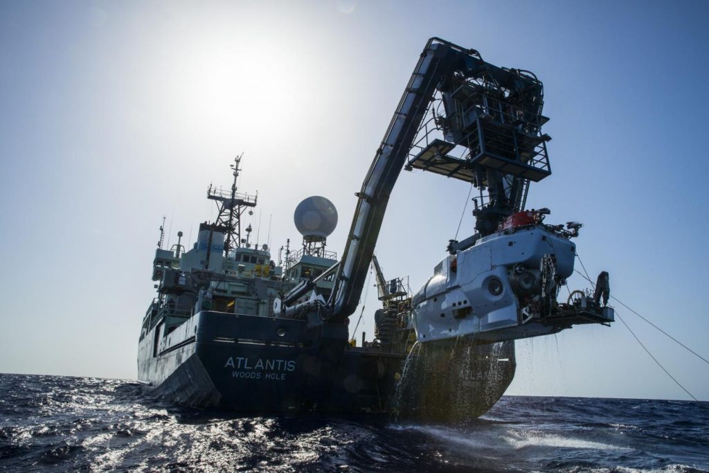 The research vessel Atlantis with the submersible Alvin hanging off its stern. Image: Luis Lamar, Woods Hood Oceanographic Institution