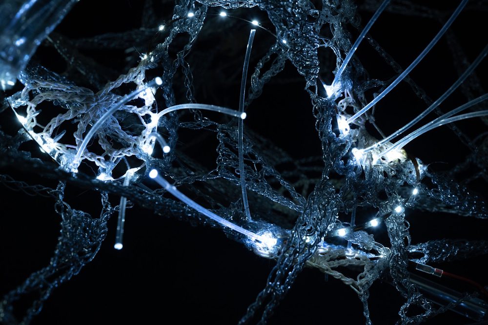 Glittering and woven, Shenlu Liu’s work seeks to champion rather than intellectualise the codes through which the body comprehends the world. In the 2025 piece Organolux (2025), knitted or woven elements reflect touch-sensitive light-emitting threads, a pathway for the viewer to re-establish their relationship with touch.