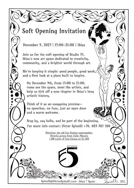 On Tuesday, 9 December 2025, Studio 55 will open its doors in Cala Llonga with a bold invitation to come, look and talk. Between 15:00 and 21:00 hours, visitors will be welcome to discover this new creative laboratory without the usual protocols of gallery openings – no speeches, no formal unveiling, just the space itself and the artists who will inhabit it.
